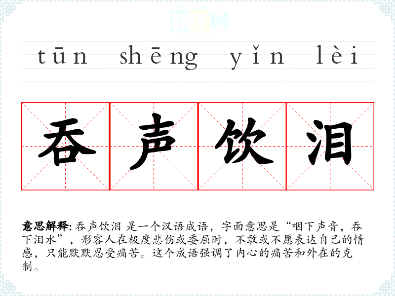 在传统文化中,吞声饮泪** 反映了儒家文化中对于忍耐和克制的重视。在社会背景中,这个成语常用来描述在社会不公或个人悲剧面前,人们的选择和反应。