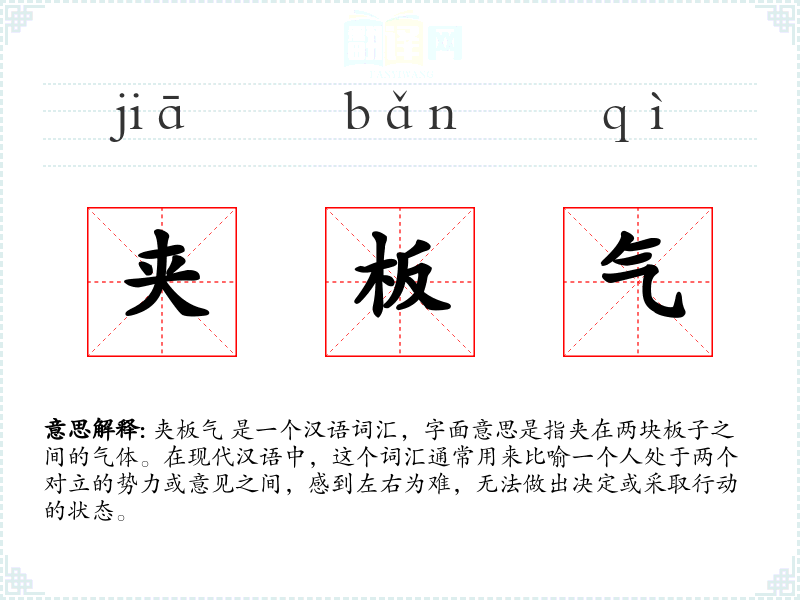夹板气 是一个汉语词汇,字面意思是指夹在两块板子之间的气体。在现代汉语中,这个词汇通常用来比喻一个人处于两个对立的势力或意见之间,感到左右为难,无法做出决定或采取行动的状态。