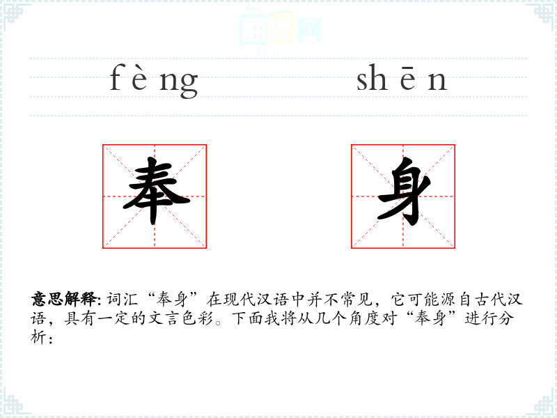 词汇“奉身”在现代汉语中并不常见,它可能源自古代汉语,具有一定的文言色彩。下面我将从几个角度对“奉身”进行分析: