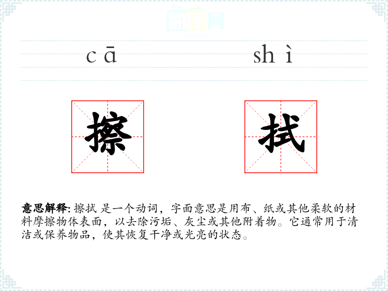 擦拭 是一个动词,字面意思是用布、纸或其他柔软的材料摩擦物体表面,以去除污垢、灰尘或其他附着物。它通常用于清洁或保养物品,使其恢复干净或光亮的状态。