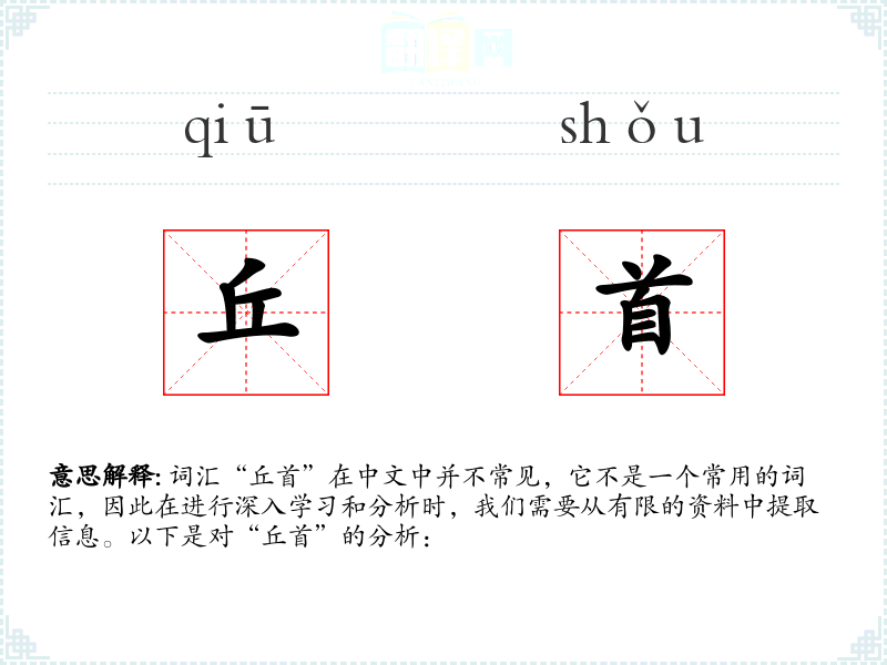 词汇“丘首”在中文中并不常见,它不是一个常用的词汇,因此在进行深入学*和分析时,我们需要从有限的资料中提取信息。以下是对“丘首”的分析: