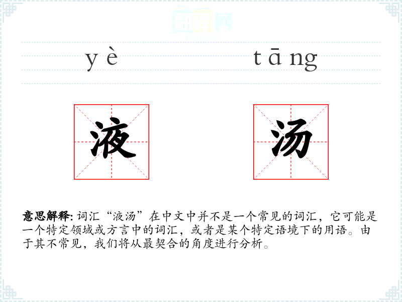 词汇“液汤”在中文中并不是一个常见的词汇,它可能是一个特定领域或方言中的词汇,或者是某个特定语境下的用语。由于其不常见,我们将从最契合的角度进行分析。