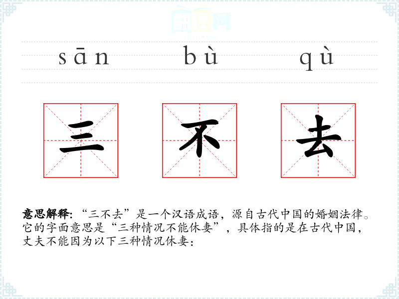 “三不去”是一个汉语成语,源自古代的婚姻法律。它的字面意思是“三种情况不能休妻”,具体指的是在古代,丈夫不能因为以下三种情况休妻: