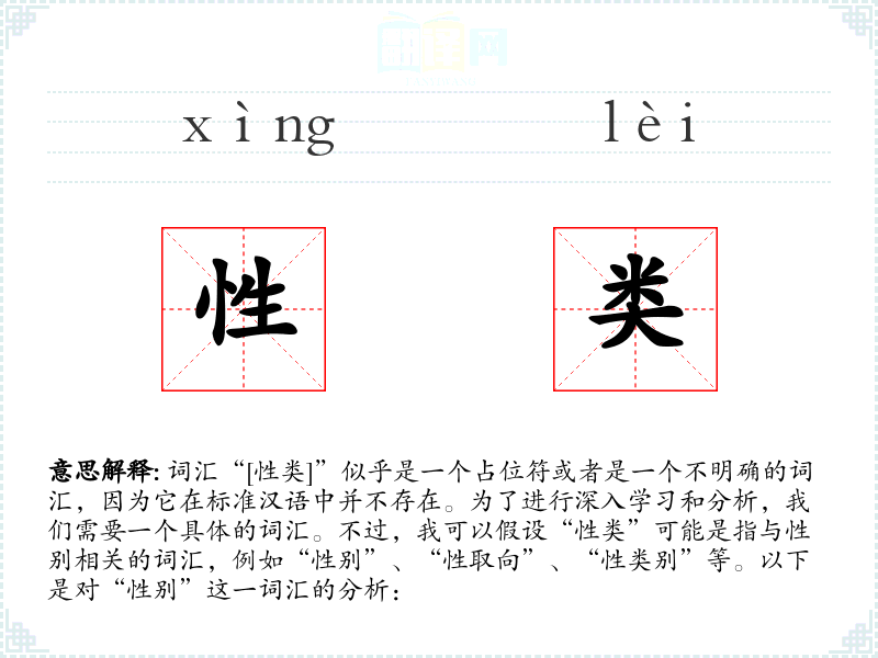 词汇“[性类]”似乎是一个占位符或者是一个不明确的词汇,因为它在标准汉语中并不存在。为了进行深入学习和分析,我们需要一个具体的词汇。不过,我可以假设“性类”可能是指与性别相关的词汇,例如“性别”、“性取向”、“性类别”等。以下是对“性别”这一词汇的分析: