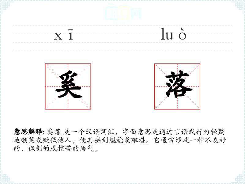 奚落 是一个汉语词汇,字面意思是通过言语或行为轻蔑地嘲笑或贬低他人,使其感到尴尬或难堪。它通常涉及一种不友好的、讽刺的或挖苦的语气。