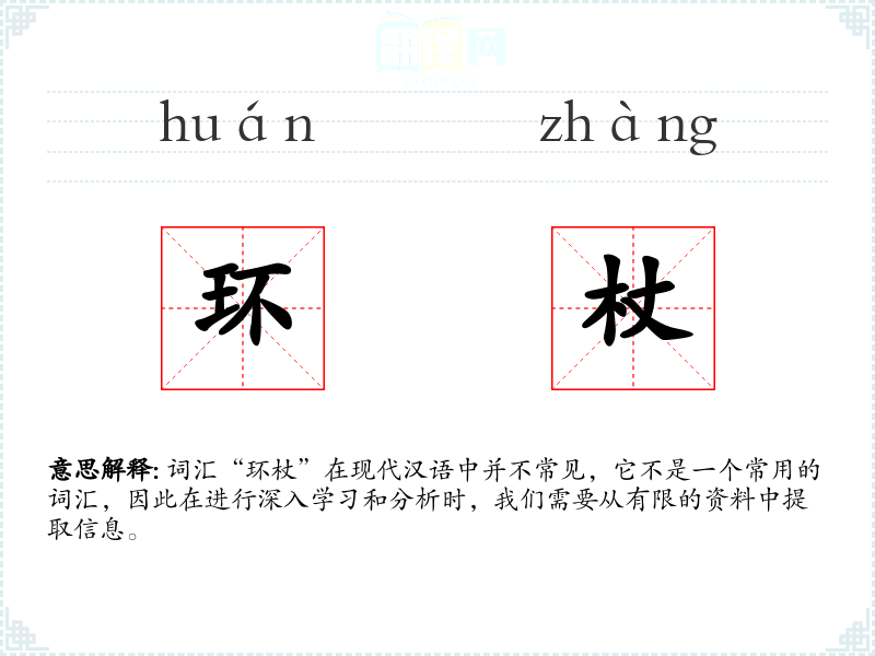 词汇“环杖”在现代汉语中并不常见,它不是一个常用的词汇,因此在进行深入学*和分析时,我们需要从有限的资料中提取信息。