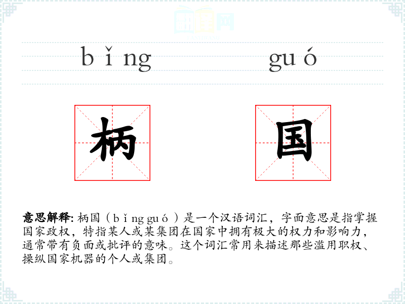 柄国(bǐng guó)是一个汉语词汇,字面意思是指掌握国家政权,特指某人或某集团在国家中拥有极大的权力和影响力,通常带有负面或批评的意味。这个词汇常用来描述那些滥用职权、操纵国家机器的个人或集团。