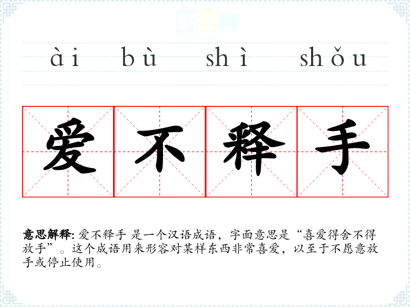 爱不释手 是一个汉语成语,字面意思是“喜爱得舍不得放手”。这个成语用来形容对某样东西非常喜爱,以至于不愿意放手或停止使用。