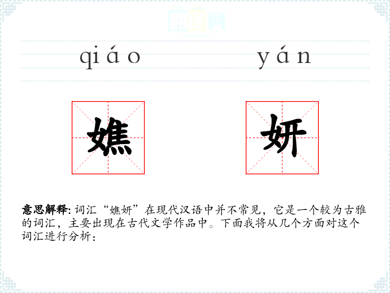 词汇“嫶妍”在现代汉语中并不常见,它是一个较为古雅的词汇,主要出现在古代文学作品中。下面我将从几个方面对这个词汇进行分析: