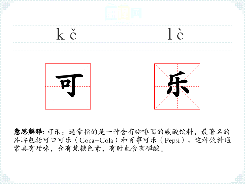 可乐:通常指的是一种含有咖啡因的碳酸饮料,最著名的品牌包括可口可乐(Coca-Cola)和百事可乐(Pepsi)。这种饮料通常具有甜味,含有焦糖色素,有时也含有磷酸。