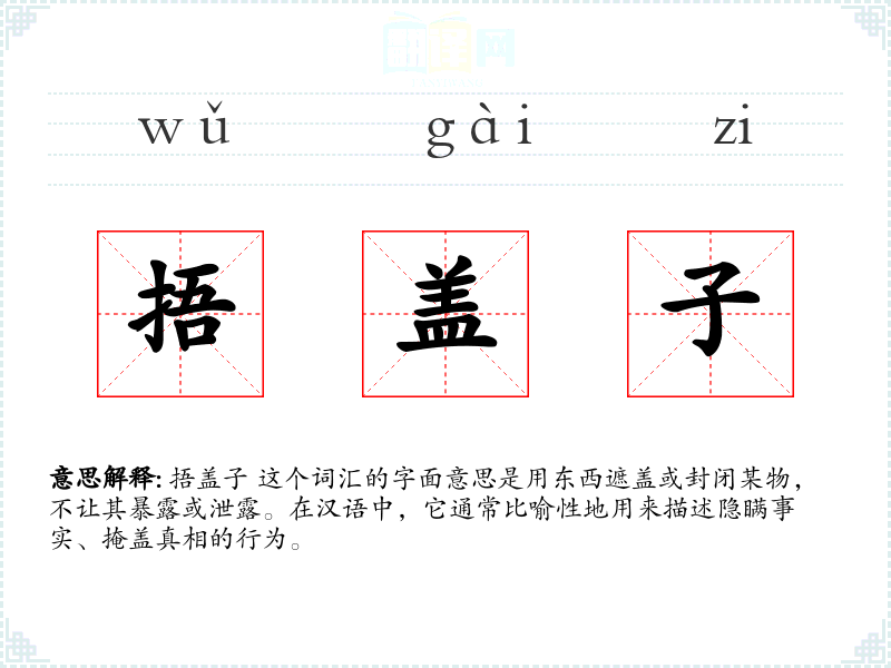 “捂盖子”这个词汇的词源较为直接,由“捂”和“盖子”两个词组成,形象地描述了遮盖的动作。在汉语中,这种由动词和名词组合而成的词汇很常见,用以形成新的比喻意义。