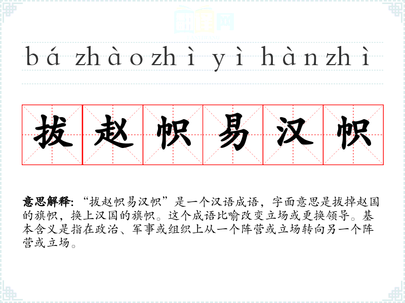 “拔赵帜易汉帜”是一个汉语成语,字面意思是拔掉赵国的旗帜,换上汉国的旗帜。这个成语比喻改变立场或更换领导。基本含义是指在政治、军事或组织上从一个阵营或立场转向另一个阵营或立场。