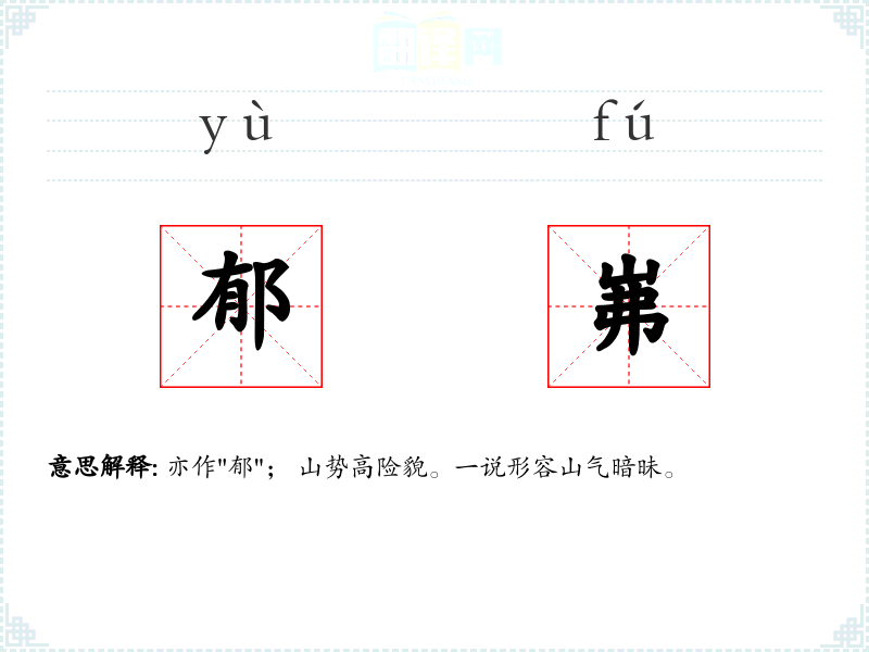亦作"郁"; 山势高险貌。一说形容山气暗昧。