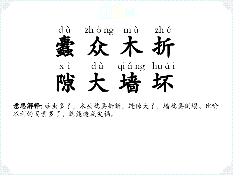 蛀虫多了,木头就要折断,缝隙大了,墙就要倒塌。比喻不利的因素多了,就能造成灾祸。