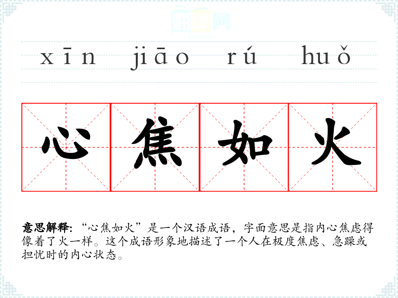 “心焦如火”是一个汉语成语,字面意思是指内心焦虑得像着了火一样。这个成语形象地描述了一个人在极度焦虑、急躁或担忧时的内心状态。