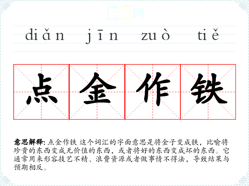 点金作铁 这个词汇可能源自**古代的炼金术传说,其中“点金”指的是将普通金属变成黄金的技艺。在现代汉语中,这个词汇被用来比喻性地描述负面转化的情况。