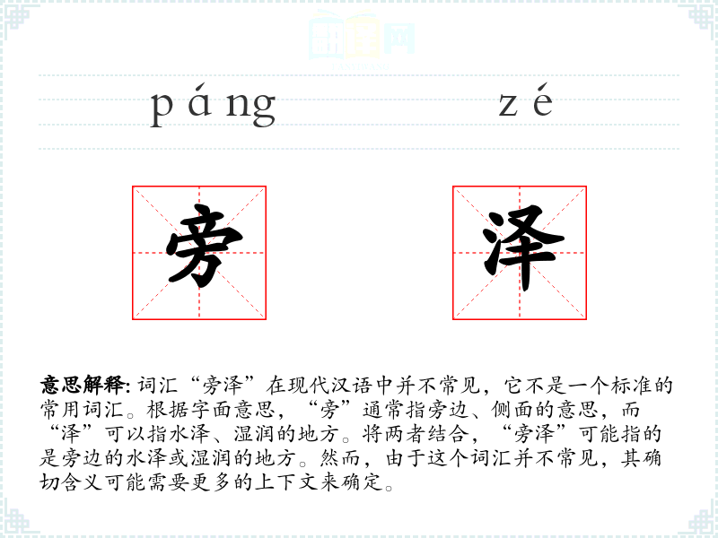 词汇“旁泽”在现代汉语中并不常见,它不是一个标准的常用词汇。根据字面意思,“旁”通常指旁边、侧面的意思,而“泽”可以指水泽、湿润的地方。将两者结合,“旁泽”可能指的是旁边的水泽或湿润的地方。然而,由于这个词汇并不常见,其确切含义可能需要更多的上下文来确定。