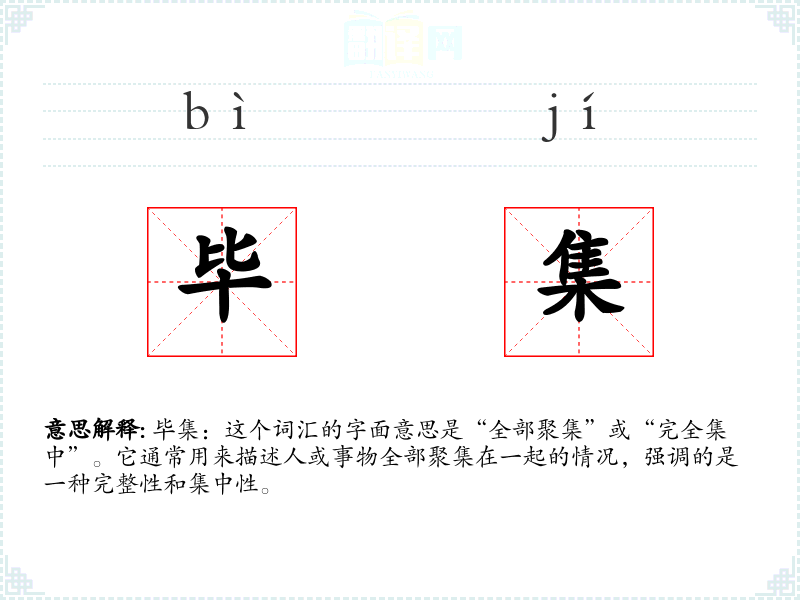 毕集:这个词汇的字面意思是“全部聚集”或“完全集中”。它通常用来描述人或事物全部聚集在一起的情况,强调的是一种完整性和集中性。