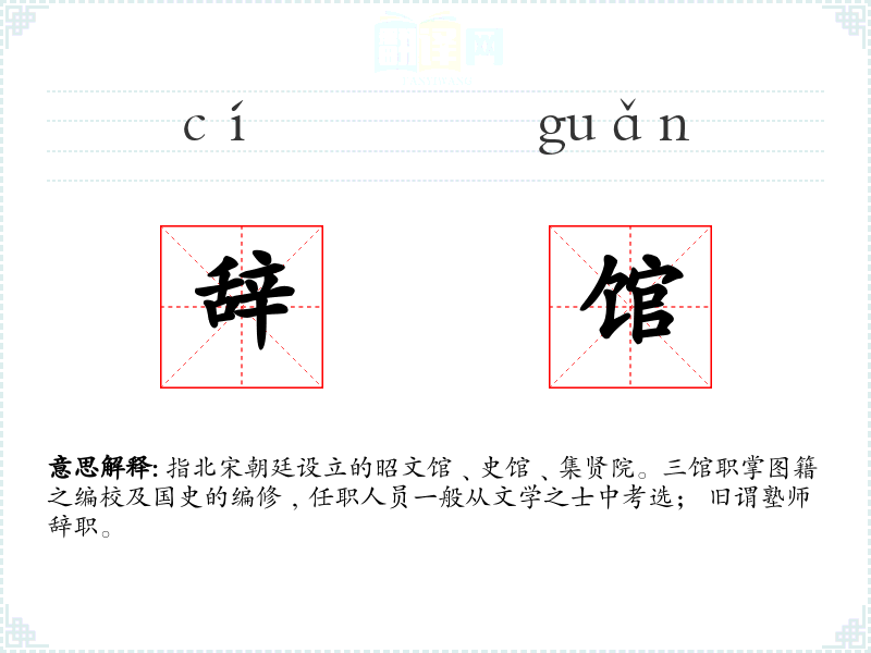 指北宋朝廷设立的昭文馆﹑史馆﹑集贤院。三馆职掌图籍之编校及国史的编修﹐任职人员一般从文学之士中考选; 旧谓塾师辞职。