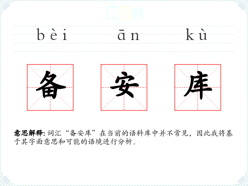 词汇“备安库”在当前的语料库中并不常见,因此我将基于其字面意思和可能的语境进行分析。