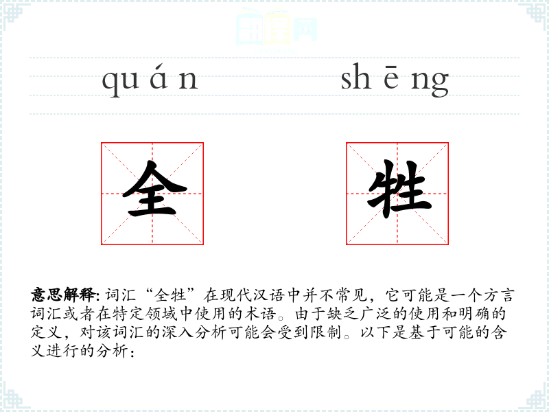 词汇“全牲”在现代汉语中并不常见,它可能是一个方言词汇或者在特定领域中使用的术语。由于缺乏广泛的使用和明确的定义,对该词汇的深入分析可能会受到限制。以下是基于可能的含义进行的分析: