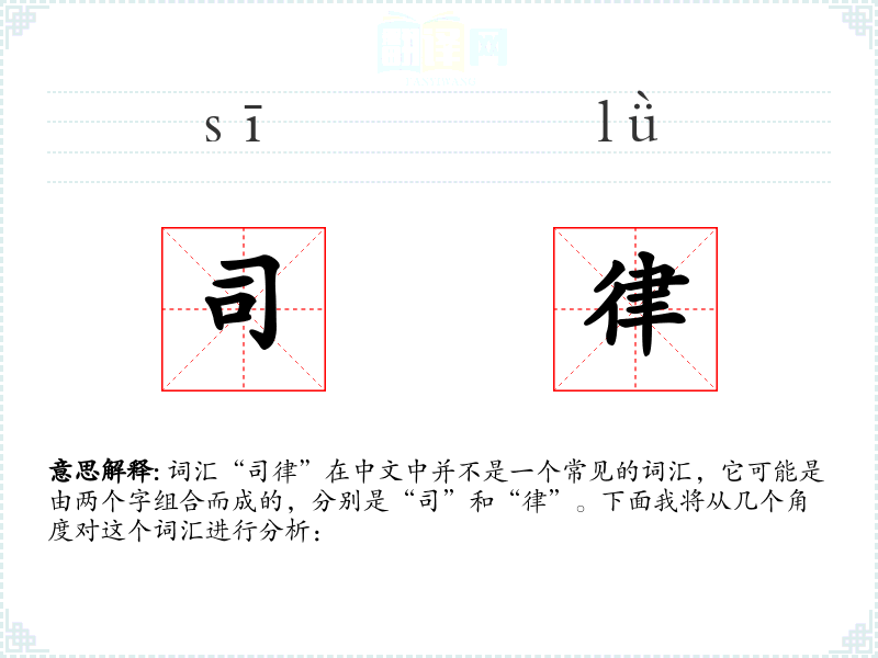 - “司”和“律”都是古代汉语词汇,组合起来可能是现代汉语中的一种创新用法,用以指代特定的法律执行机构或职位。