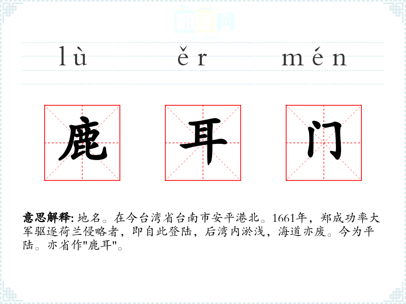 地名。在今台湾省台南市安平港北。1661年,郑成功率大军驱逐荷兰侵略者,即自此登陆,后湾内淤浅,海道亦废。今为平陆。亦省作"鹿耳"。