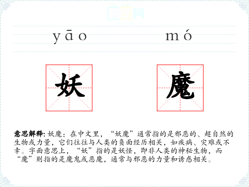 妖魔:在中文里,“妖魔”通常指的是邪恶的、超自然的生物或力量,它们往往与人类的负面经历相关,如疾病、灾难或不幸。字面意思上,“妖”指的是妖怪,即非人类的神秘生物,而“魔”则指的是魔鬼或恶魔,通常与邪恶的力量和诱惑相关。