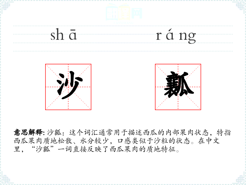 在文学作品中,“沙瓤”可能被用来形容某种干燥、贫瘠或缺乏生机的状态,不仅仅局限于西瓜。在口语中,人们常用“沙瓤”来形容西瓜的品质,尤其是在讨论西瓜的口感和新鲜度时。在专业领域,如农业或食品科学中,“沙瓤”可能被用来描述特定品种的西瓜或其成熟度。
