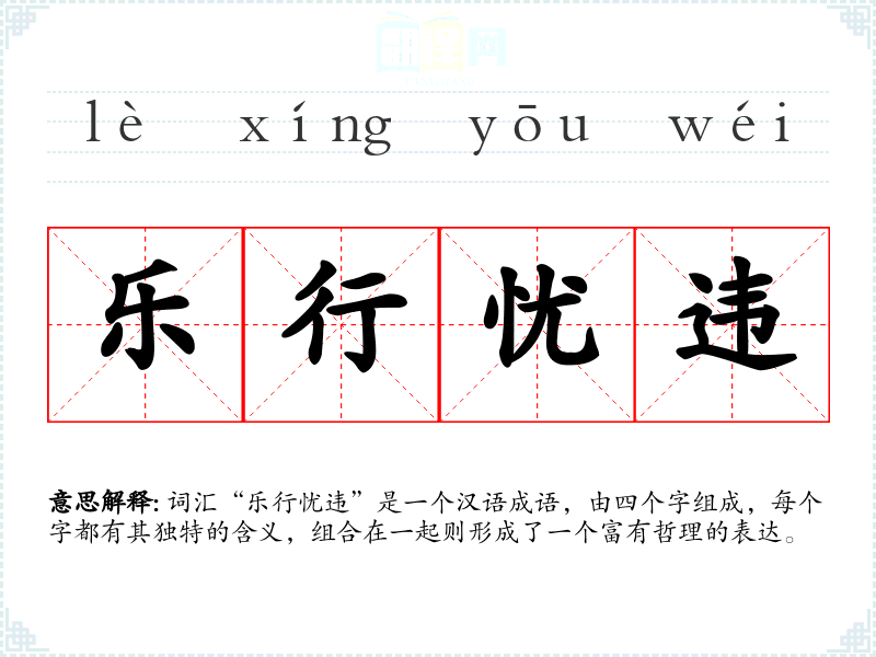 词汇“乐行忧违”是一个汉语成语,由四个字组成,每个字都有其独特的含义,组合在一起则形成了一个富有哲理的表达。