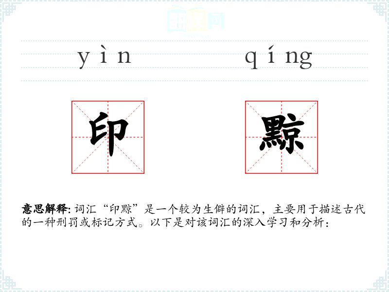 词汇“印黥”是一个较为生僻的词汇,主要用于描述古代的一种刑罚或标记方式。以下是对该词汇的深入学*和分析: