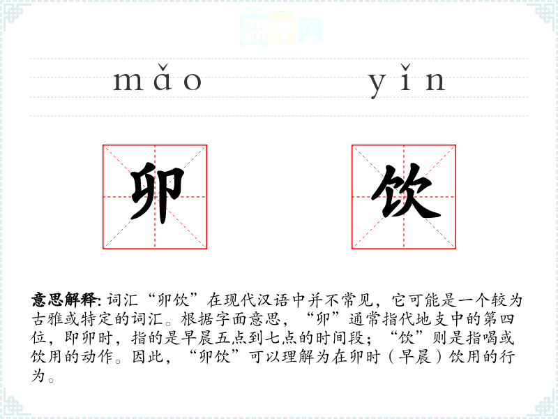 词汇“卯饮”在现代汉语中并不常见,它可能是一个较为古雅或特定的词汇。根据字面意思,“卯”通常指代地支中的第四位,即卯时,指的是早晨五点到七点的时间段;“饮”则是指喝或饮用的动作。因此,“卯饮”可以理解为在卯时(早晨)饮用的行为。