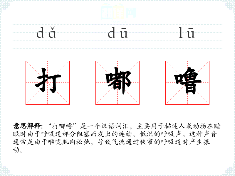 - 反义词:静默、无声(这些词描述的是没有声音的状态,与“打嘟噜”形成对比)