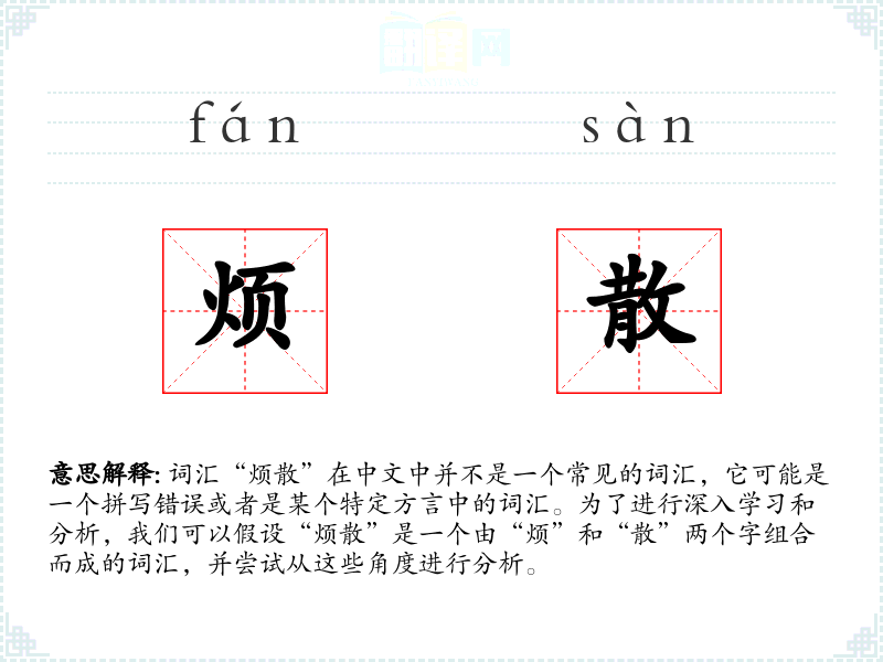 词汇“烦散”在中文中并不是一个常见的词汇,它可能是一个拼写错误或者是某个特定方言中的词汇。为了进行深入学习和分析,我们可以假设“烦散”是一个由“烦”和“散”两个字组合而成的词汇,并尝试从这些角度进行分析。