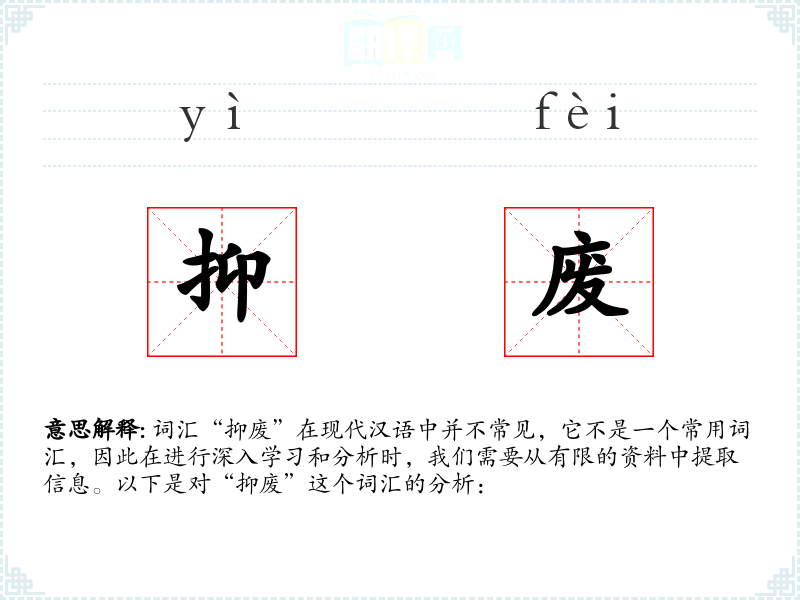 词汇“抑废”在现代汉语中并不常见,它不是一个常用词汇,因此在进行深入学习和分析时,我们需要从有限的资料中提取信息。以下是对“抑废”这个词汇的分析:
