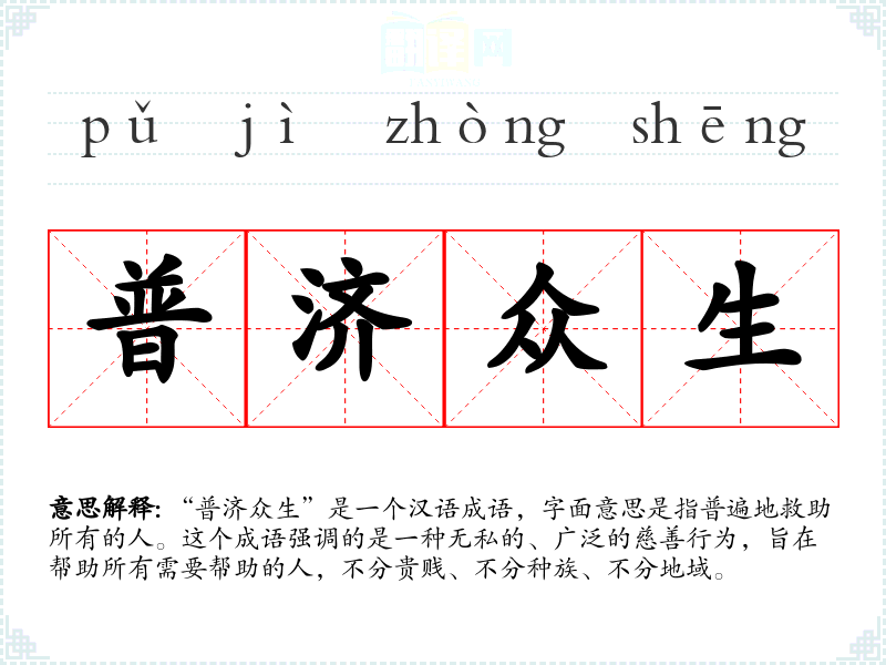 “普济众生”是一个汉语成语,字面意思是指普遍地救助所有的人。这个成语强调的是一种无私的、广泛的慈善行为,旨在帮助所有需要帮助的人,不分贵贱、不分种族、不分地域。