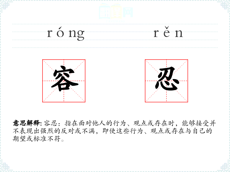 - 文学:在文学作品中,“容忍”常常用来描述人物的内心世界,展现其宽广的胸怀或对复杂人际关系的处理能力。