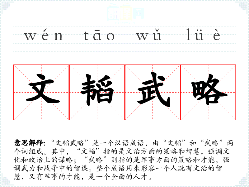 “文韬武略”是一个汉语成语,由“文韬”和“武略”两个词组成。其中,“文韬”指的是文治方面的策略和智慧,强调文化和政治上的谋略;“武略”则指的是军事方面的策略和才能,强调武力和战争中的智谋。整个成语用来形容一个人既有文治的智慧,又有军事的才能,是一个全面的人才。