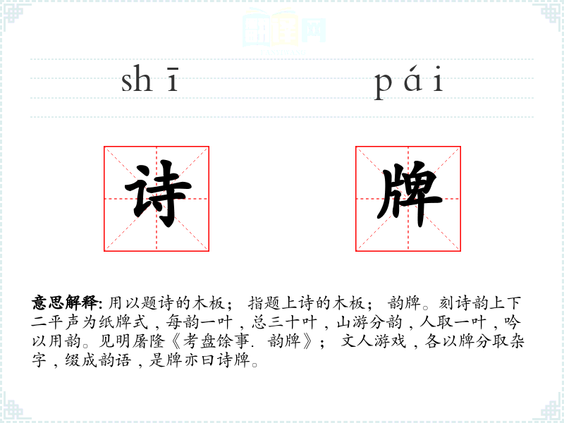 1.用以题诗的木板; 指题上诗的木板; 韵牌。刻诗韵上下二平声为纸牌式﹐每韵一叶﹐总三十叶﹐山游分韵﹐人取一叶﹐吟以用韵。见明屠隆《考盘馀事.韵牌》; 文人游戏﹐各以牌分取杂字﹐缀成韵语﹐是牌亦曰诗牌。