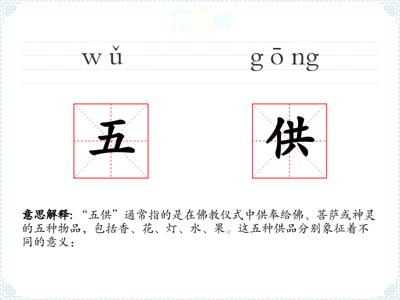 - 反义词:无(由于“五供”是一个特定**仪式中的术语,通常没有直接的反义词)