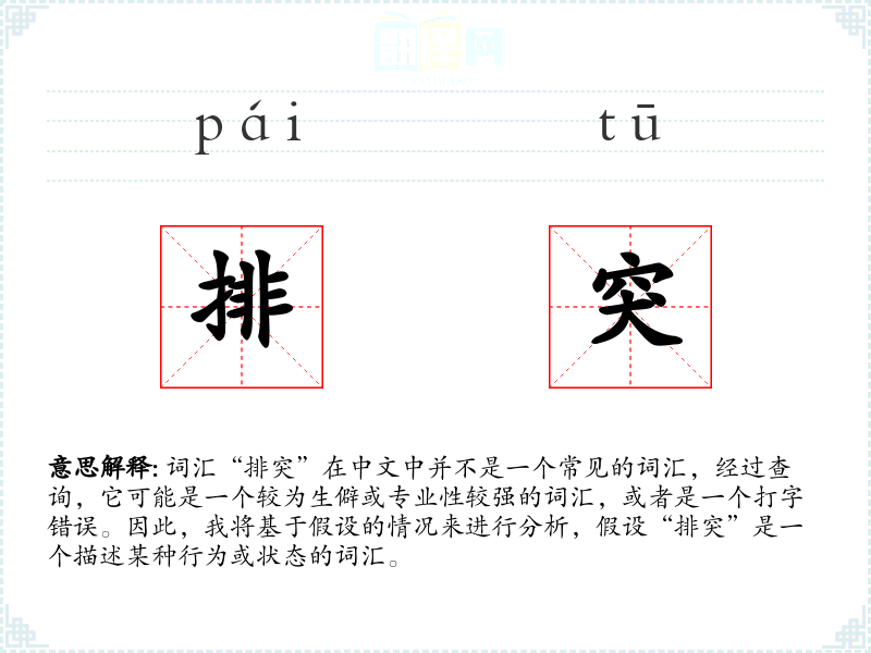 词汇“排突”在中文中并不是一个常见的词汇,经过查询,它可能是一个较为生僻或专业性较强的词汇,或者是一个打字错误。因此,我将基于假设的情况来进行分析,假设“排突”是一个描述某种行为或状态的词汇。
