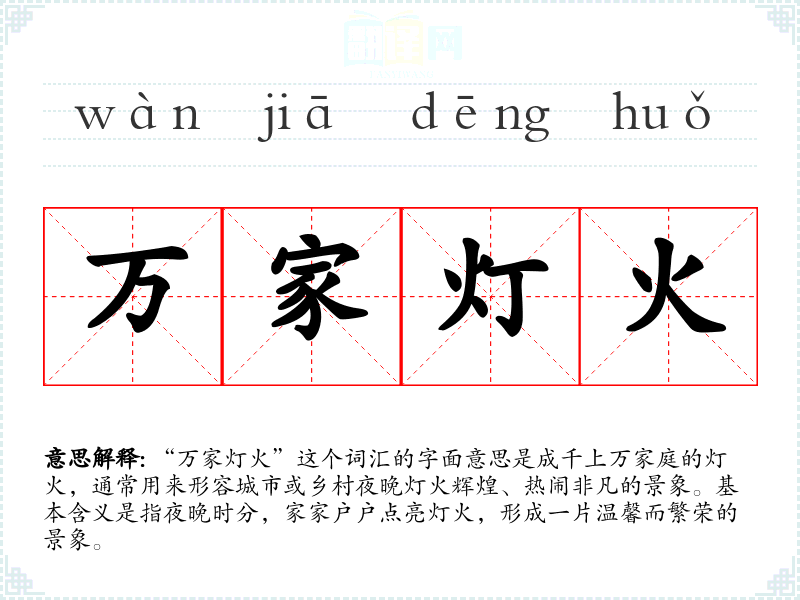 “万家灯火”这个词汇的字面意思是成千上万家庭的灯火,通常用来形容城市或乡村夜晚灯火辉煌、热闹非凡的景象。基本含义是指夜晚时分,家家户户点亮灯火,形成一片温馨而繁荣的景象。