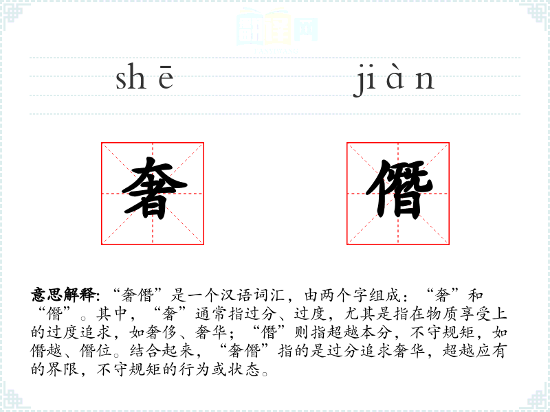 “奢”字最早见于《说文解字》,原意为“大”,后引申为过度、过分。“僭”字同样在《说文解字》中有记载,原意为“超越”,后引申为不守规矩、超越本分。两个字的结合,体现了对过度和不守规矩行为的批评。