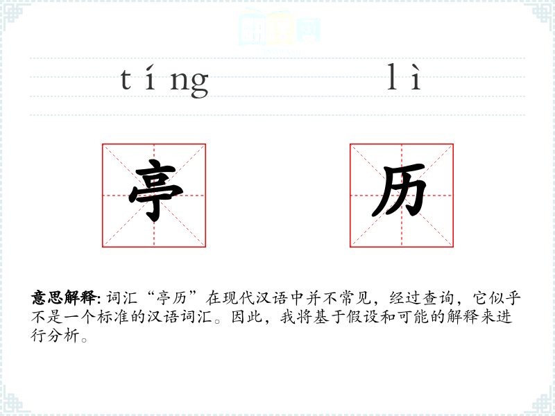 词汇“亭历”在现代汉语中并不常见,经过查询,它似乎不是一个标准的汉语词汇。因此,我将基于假设和可能的解释来进行分析。