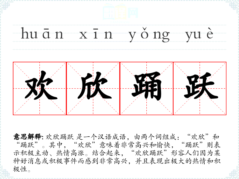 在英语中,类似的表达可能是“jubilant and enthusiastic”,虽然意思相近,但“欢欣踊跃”更具有**特色,且在表达上更加生动和形象。