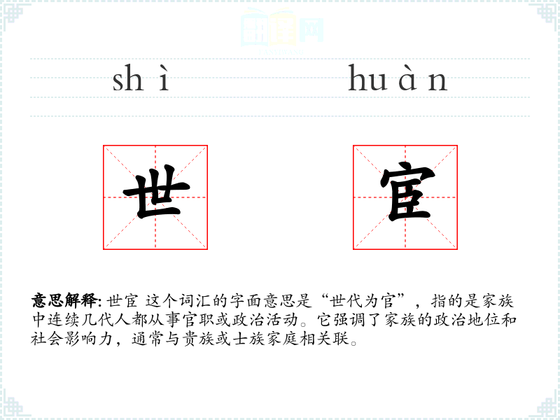 世宦 这个词汇的字面意思是“世代为官”,指的是家族中连续几代人都从事官职或政治活动。它强调了家族的政治地位和社会影响力,通常与贵族或士族家庭相关联。