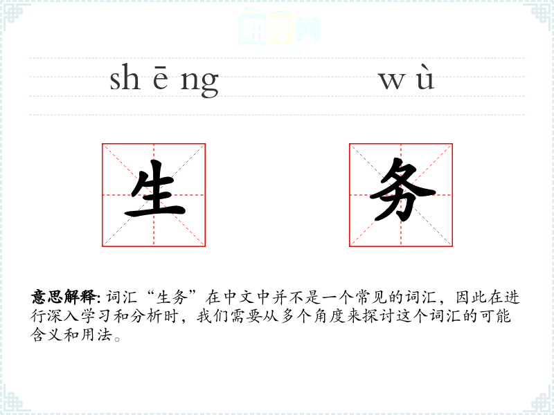 词汇“生务”在中文中并不是一个常见的词汇,因此在进行深入学习和分析时,我们需要从多个角度来探讨这个词汇的可能含义和用法。