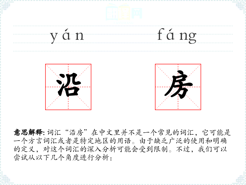 词汇“沿房”在中文里并不是一个常见的词汇,它可能是一个方言词汇或者是特定地区的用语。由于缺乏广泛的使用和明确的定义,对这个词汇的深入分析可能会受到限制。不过,我们可以尝试从以下几个角度进行分析:
