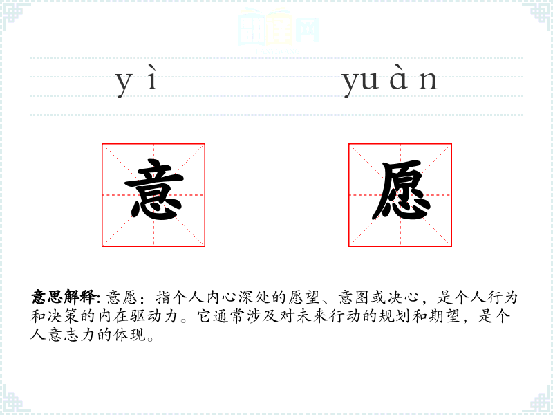 意愿:指个人内心深处的愿望、意图或决心,是个人行为和决策的内在驱动力。它通常涉及对未来行动的规划和期望,是个人意志力的体现。