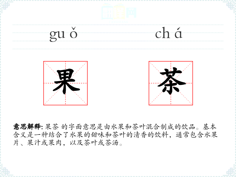 果茶 的字面意思是由水果和茶叶混合制成的饮品。基本含义是一种结合了水果的甜味和茶叶的清香的饮料,通常包含水果片、果汁或果肉,以及茶叶或茶汤。